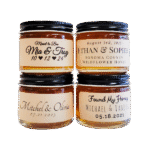 With a four case order of any size jar and available honey/tea, we can customize a label to include your wedding message, corporate logo or monogram printed on our standard Kraft label paper in black ink for no extra charge. Please include your message and font and allow three weeks lead time after ordering in advance of pick up or shipping.