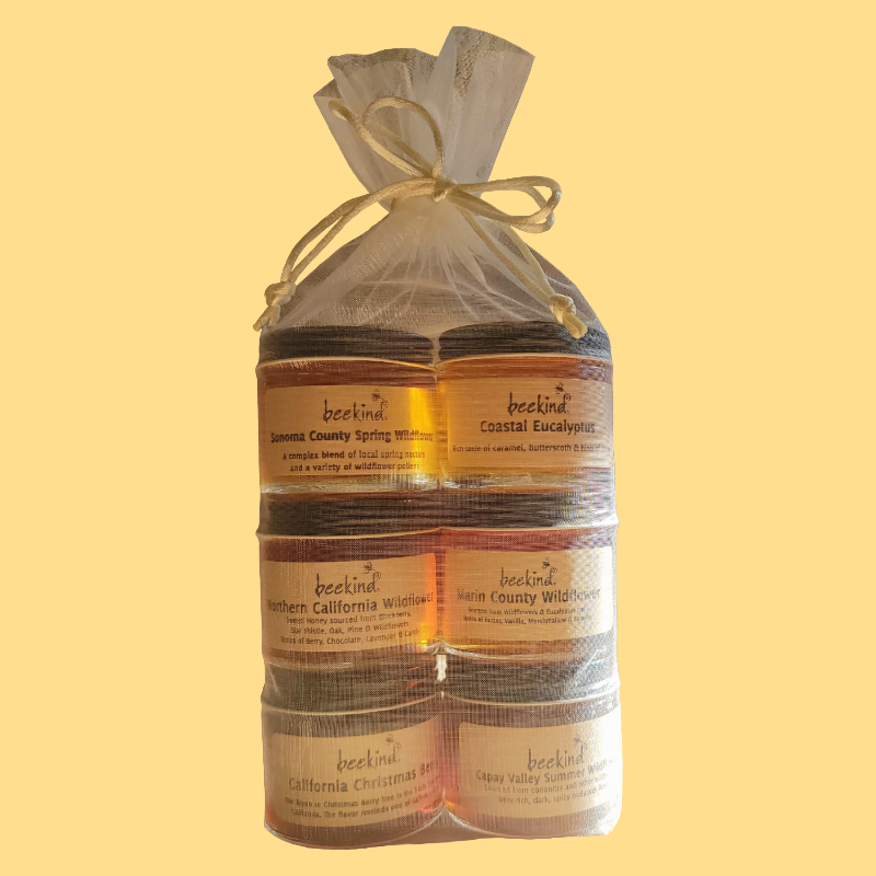 Bring the honey tasting bar to your doorstep & experience variety with our curated honey flights! Set of six or four 3oz jars of our most local honey from the Bay Area & Northern California, tucked in our transparent organza bag with gift tag included. Exact honeys to vary based on seasonal availability. Color of organza bag may vary.