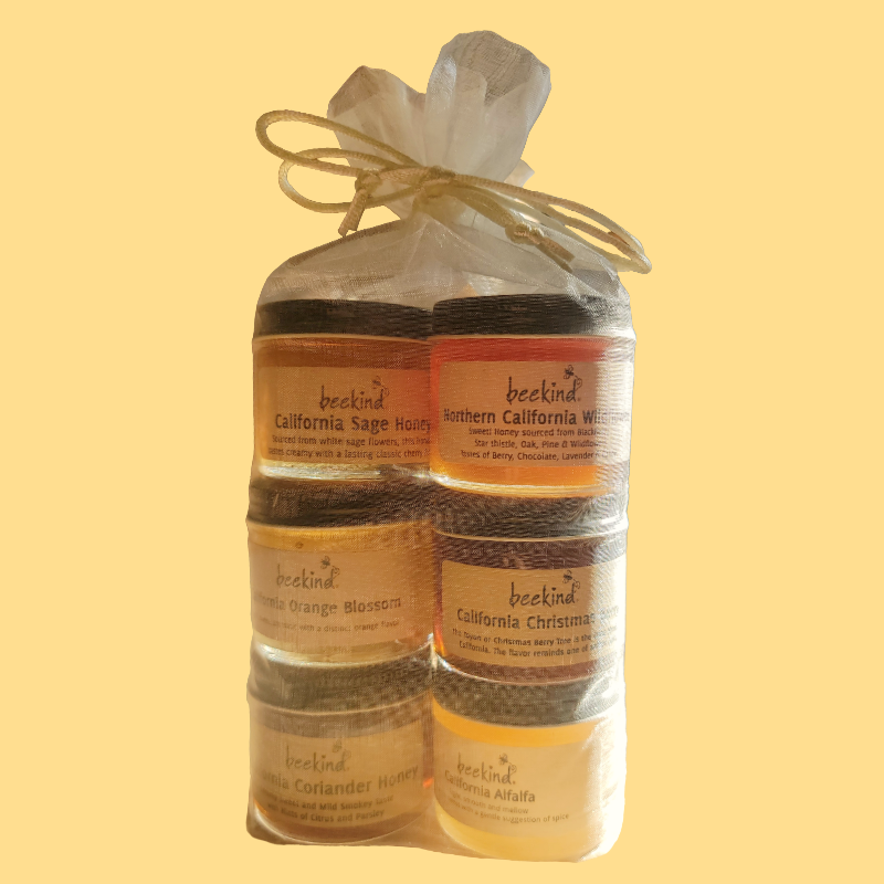 Bring the honey tasting bar to your doorstep & experience variety with our curated honey flights! Set of six or four 3oz jars of Californian honey in transparent organza bag with gift tag included. Exact honey varieties to vary based on seasonal availability. Color of organza bag may vary.