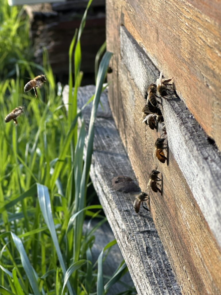 Honeybees return to hive behind Beekind's store in Sebastopol (above)